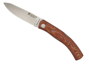 Navaja de carraca Serie Seda Ámbar, realizada con tecnología CNC, mango con virolas de acero inoxidable con bajo relieve decorativo basado en navajas clásicas españolas del siglo XIX e inserciones de acrilico azul , muelle y palanquilla decorada. Con caja de presentación.