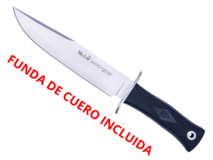 El precio original era: 64,95 €.59,95 €El precio actual es: 59,95 €.Cuchillo de caza con empuñadura de goma y guarda de acero inoxidable, con agujero para cordón fiador, viene acompañado de funda de cuero.