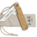 Navaja con acero de damasco de 73 capas . Dotada de rodamiento para apertura mas fluida, cordón fiador con detalle metálico y  funda de piel decorada.