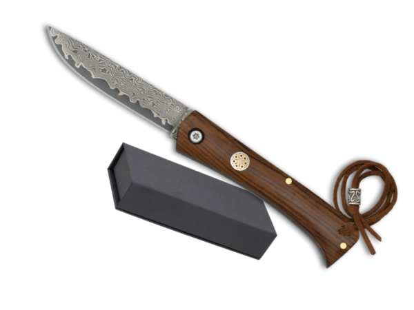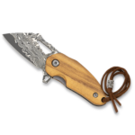 Navaja de pistón con hoja de acero de damasco de 73 capas y mango de madera con pin decorativo, incluye cordón fiador con abalorio.