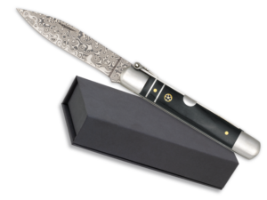 Navaja clásica tipo machete con mango de stamina negra y decorada con pin mosaico con hoja de acero de damasco de 60 capas y bloqueo de palanquilla