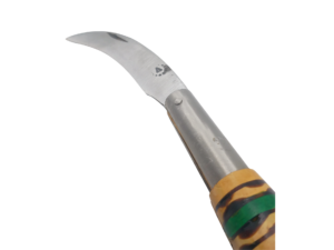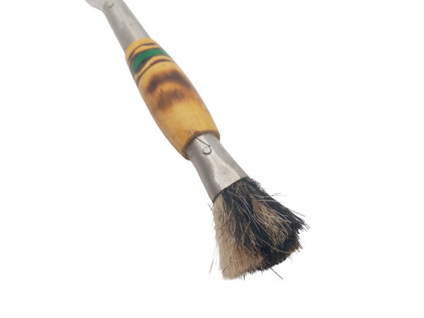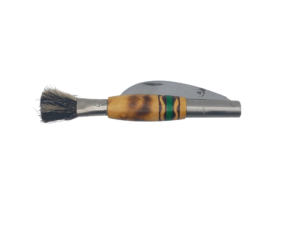 Navaja artesana hecha totalmente a mano en Taramundi, hoja forjada en acero inox. mova.  de 7.5 cms con forma curvada ideal para la recolección de setas, mango en madera de boj quemado decorado en verde, virola de acero inox. con la marca estampada y cepillo de cerda de crin de caballo