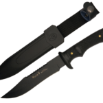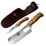 Nieto Grillo 130-G granadillo, hoja drop point en acero inoxidable Bohler N695 y empuñadura de madera de granadillo con separadores de fibra rojo. Incluye funda de cuero marrón. Diseñado por Manuel de la Torre.