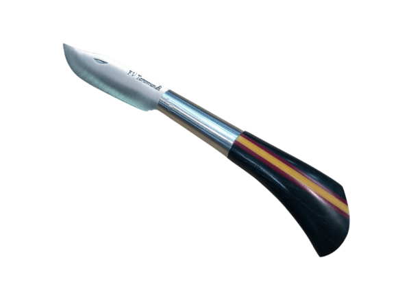 Navaja de micarta con bandera de España (punta vuelta) elaborada de forma artesanal por el artesano Francisco Vega en Taramundi (Asturias). Navaja original e innovadora.