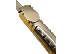 Navaja fabricada artesanalmente en España, con virola y rebajo de latón, cachas de asta de toro de lidia y muelle en acero inoxidable adornado a lima y palanquilla rodea, hoja en acero molibdeno vanadio con adornos a lima