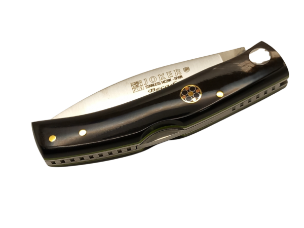 Navaja de caza Joker Becada con cachas de búalo, pin mosaico y separadores verdes, presentada en estuche