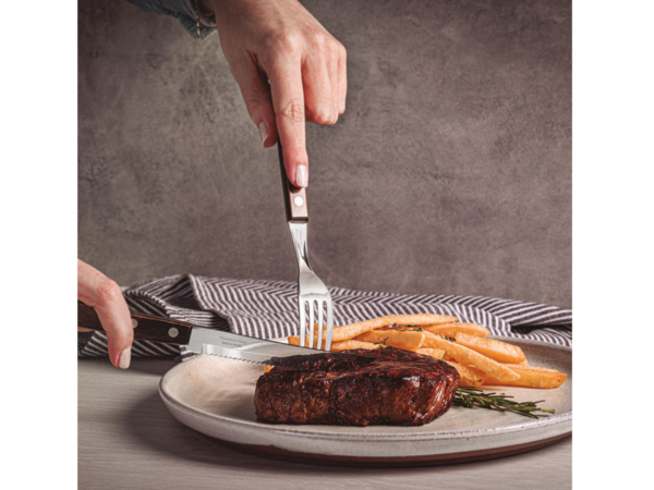 Este Juego está compuesto por 6 tenedores, 6 cuchillos de mesa postre fabricado en acero inoxidable y mango en madera poliwood. Ideales para comer carne como el churrasco. Son aptos para el lavavajillas y vienen presentados en caja.