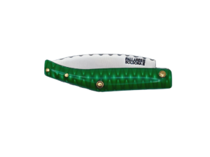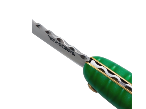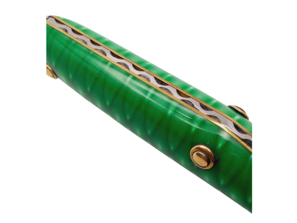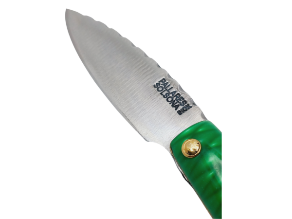 Modificación artesanal de una navaja pallares común 00 con lomo y muelle decorado a lima,  forros de latón y cachas juma verde con patrón serpiente, todo pulido, afilado y ensamblado de manera totalmente artesana.