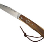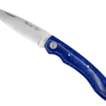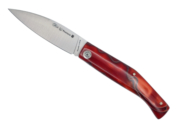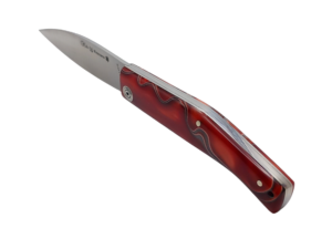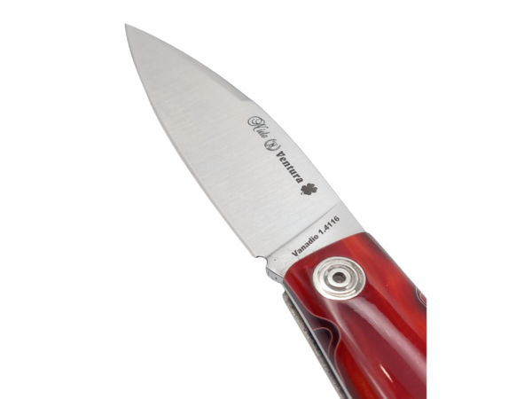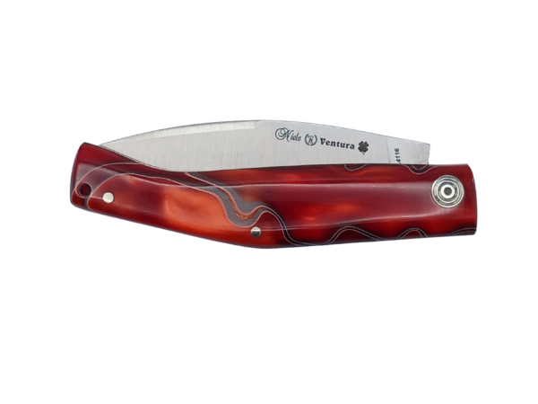 Mango de Metacrilato, remachado con remaches de acero, forros de acero y sistema de cierre de pistón .Hoja con falso contrafilo.
