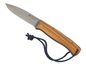 Navaja de carraca Serie Seda Ámbar, realizada con tecnología CNC, mango con virolas de acero inoxidable con bajo relieve decorativo basado en navajas clásicas españolas del siglo XIX e inserciones de acrilico azul , muelle y palanquilla decorada. Con caja de presentación.