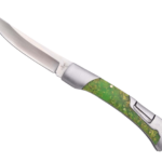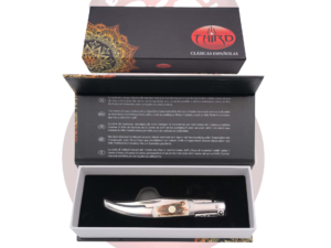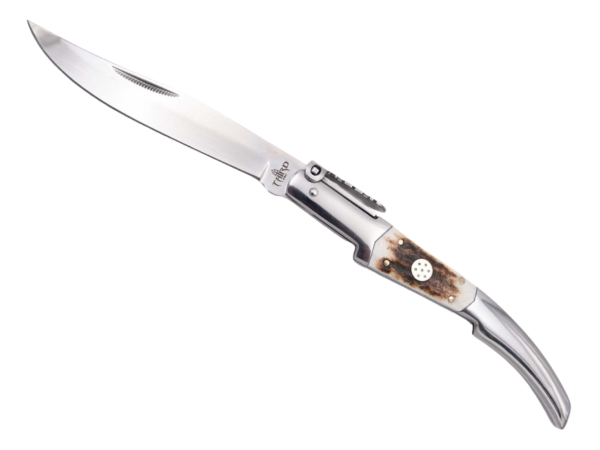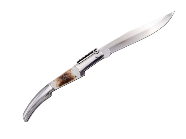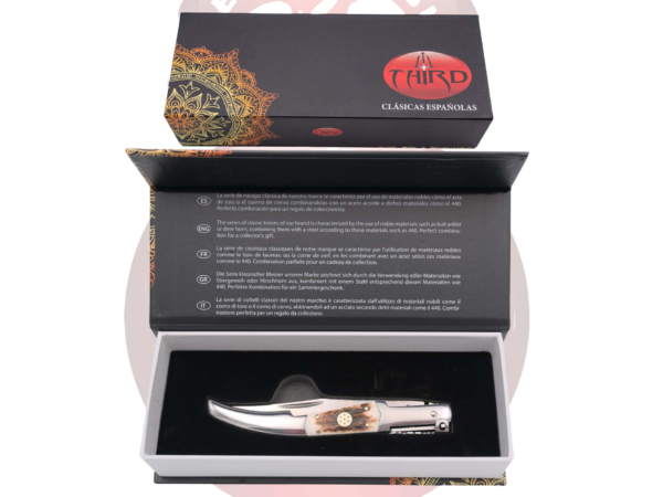 Navaja de carraca de Third Serie Ciervo N49C, realizadas con tecnología CNC, mango con virolas de acero acabadas en brillo espejo e inserciones de asta de ciervo auténtica con decoración en el centro, hoja de acero 440 acabada en brillo espejo de 11 cm, con el muelle y la palanquilla decorada. Con caja de presentación.