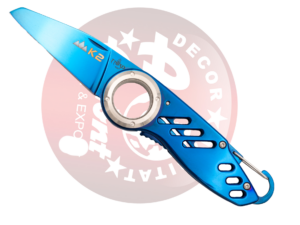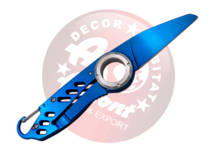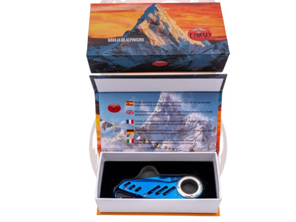 Navaja Third N125, modelo K2 de alpinismo, mango de acero bañado en azul titanio acabado brillante con agujero en el mango para su uso en alpinismo para asegurar la navaja a un cabo, hoja de acero de 6,9 cm bañada en azul titanio acabado brillante. Con caja de presentación.