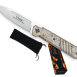 Navaja tipo estilete de inspiración japonesa con cachas de G-10 y fibra de carbono con rodamientos y construcción CNC y bloqueo liner, viene acompañada de una funda de terciopelo.