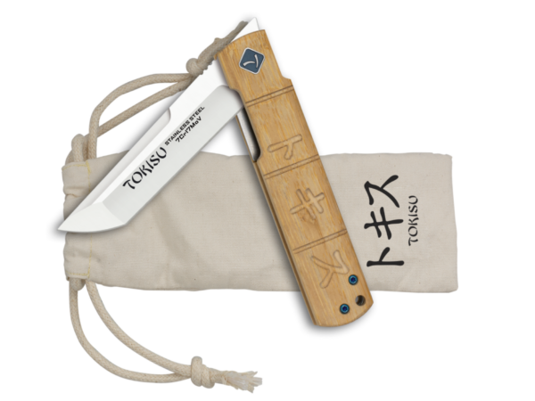 Navaja tipo japonés con cabo de bambú apertura con rodamientos y bloqueo liner lock, viene acompañada por una funda de algodón.