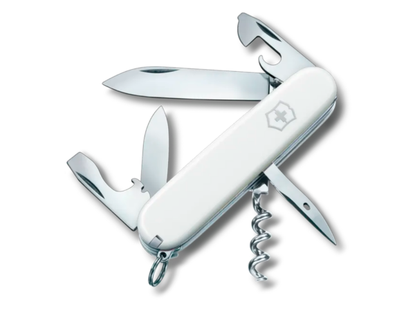 Hoja grande|Hoja pequeña|Sacacorchos| Abrelatas| Destornillador pequeño (también para tornillos de cruz)| Destapador| Destornillador| Desaislador pelacables| Punzón escariador| Anilla inoxidable| Pinzas| Palillo de dientes