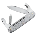 Hoja grande / Tijeras / Abrecajas / Destornillador 3 mm / Lima de uñas / Limpiauñas / Destapador / Destornillador 7 mm / Pela cables / Broche para transportar